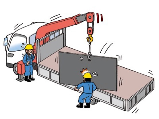 道路貨物運送業の事業場で、車両積載型移動式クレーンを使って鉄板をトラックに積み込む作業中に、