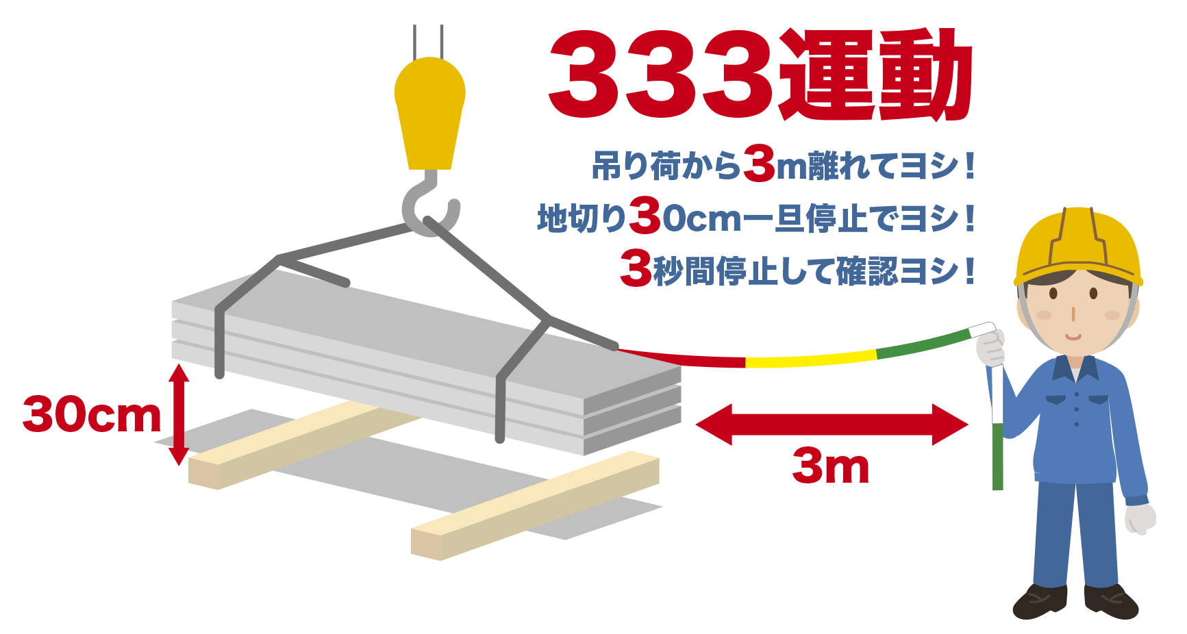 クレーン作業の安全性を高めるための指針として、多くの現場で取り入れられているのが「3・3・3運動」です。この運動の各項目において、介錯ロープは非常に重要な役割を果たします。