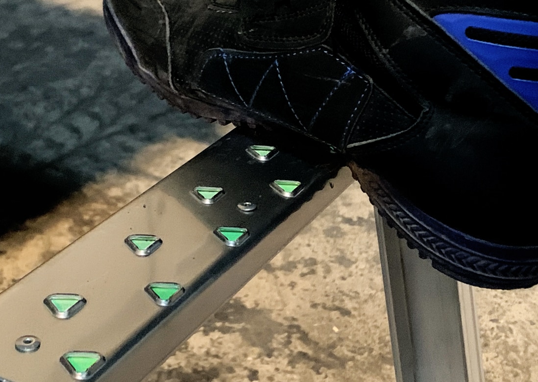三角突起が靴底をしっかりグリップします。水や油が付いていても滑らず、安心して昇降できます。さらに、ステップ部には暗闇で光る蓄光機能が付いており、暗い現場や夜間でも踏み外しを防止します。