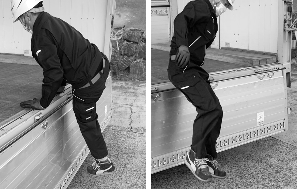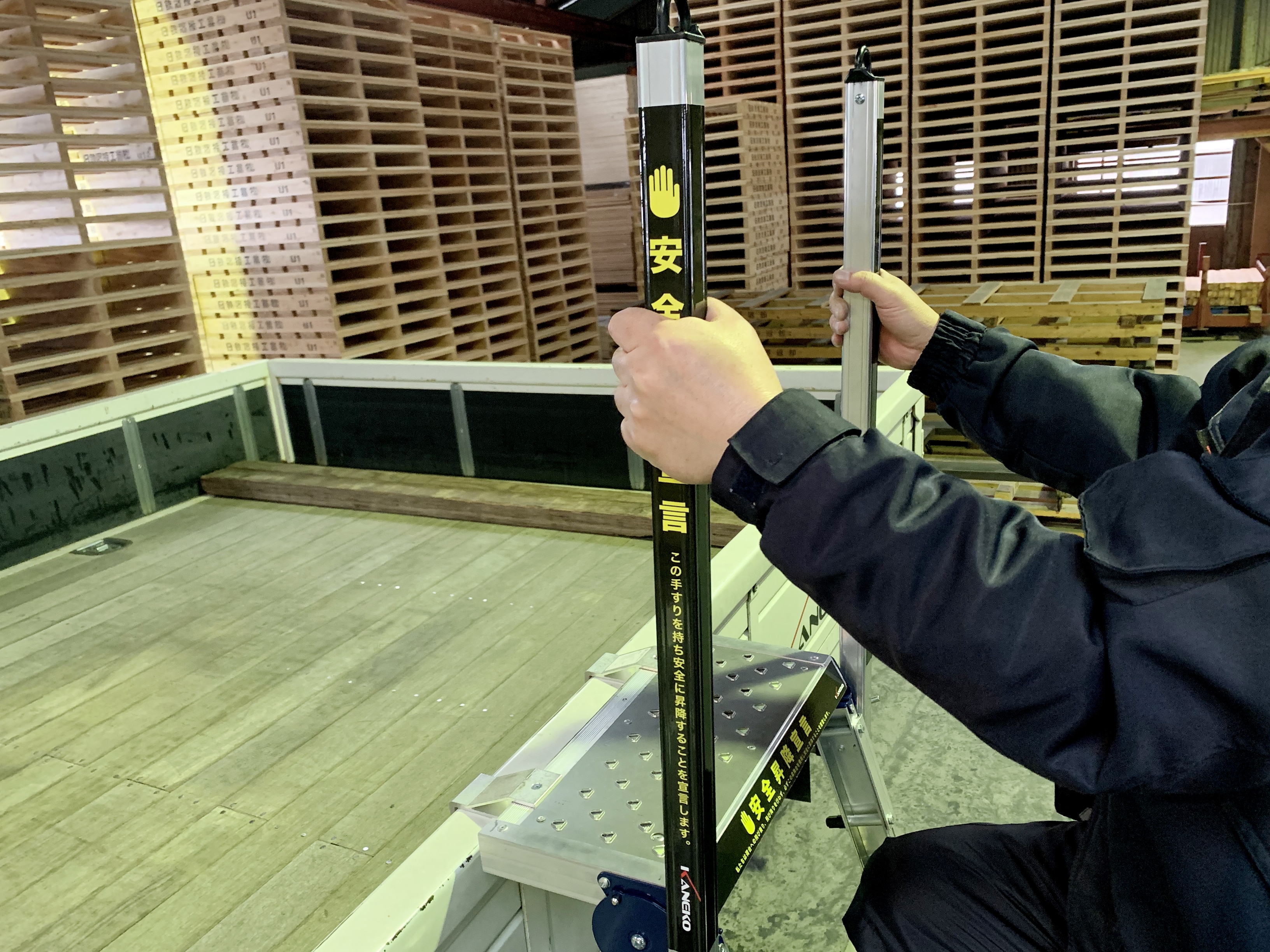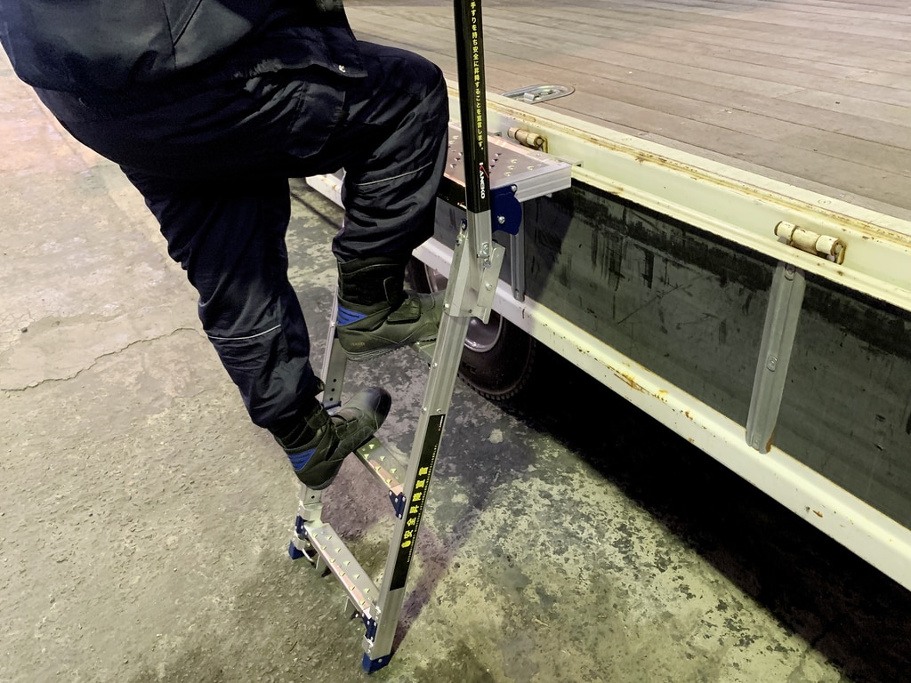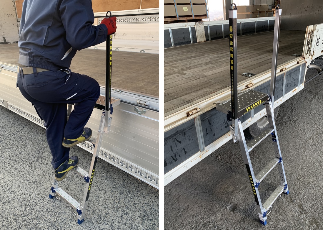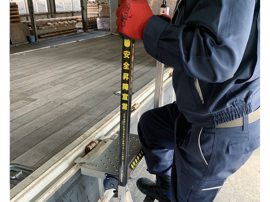 手すりを両手でしっかり握って昇降でき、後ろ向きで降りる習慣付けに繋がります。荷台のアオリ部分と地面の4点でしっかり支持できるので、脚立や引っ掛け型昇降台と違い、転倒やグラつきの心配がなく、安定した設置が可能です。アオリを下した状態でも、起こした状態でも設置可能です。