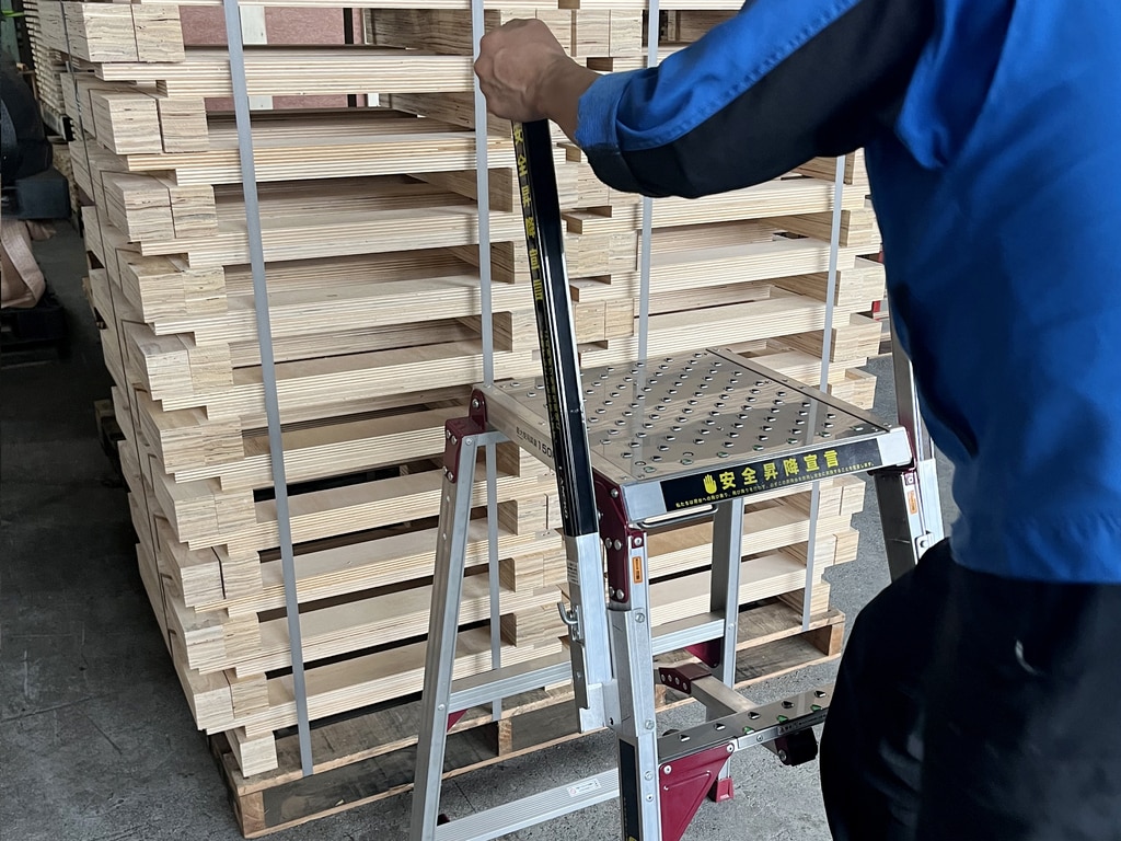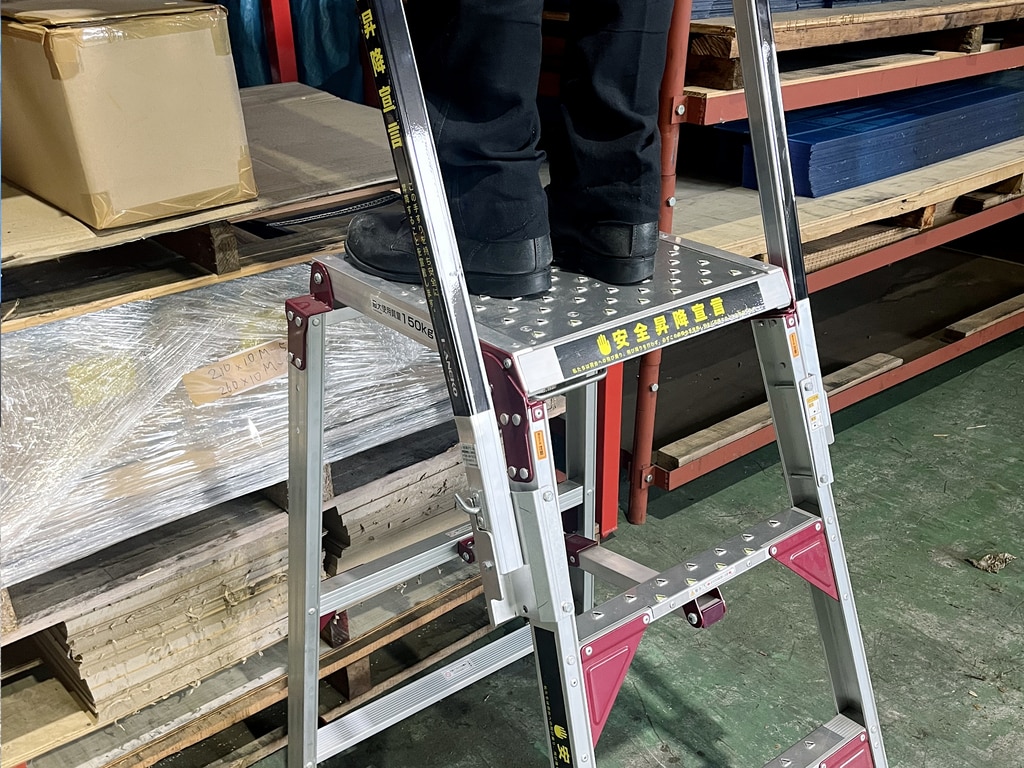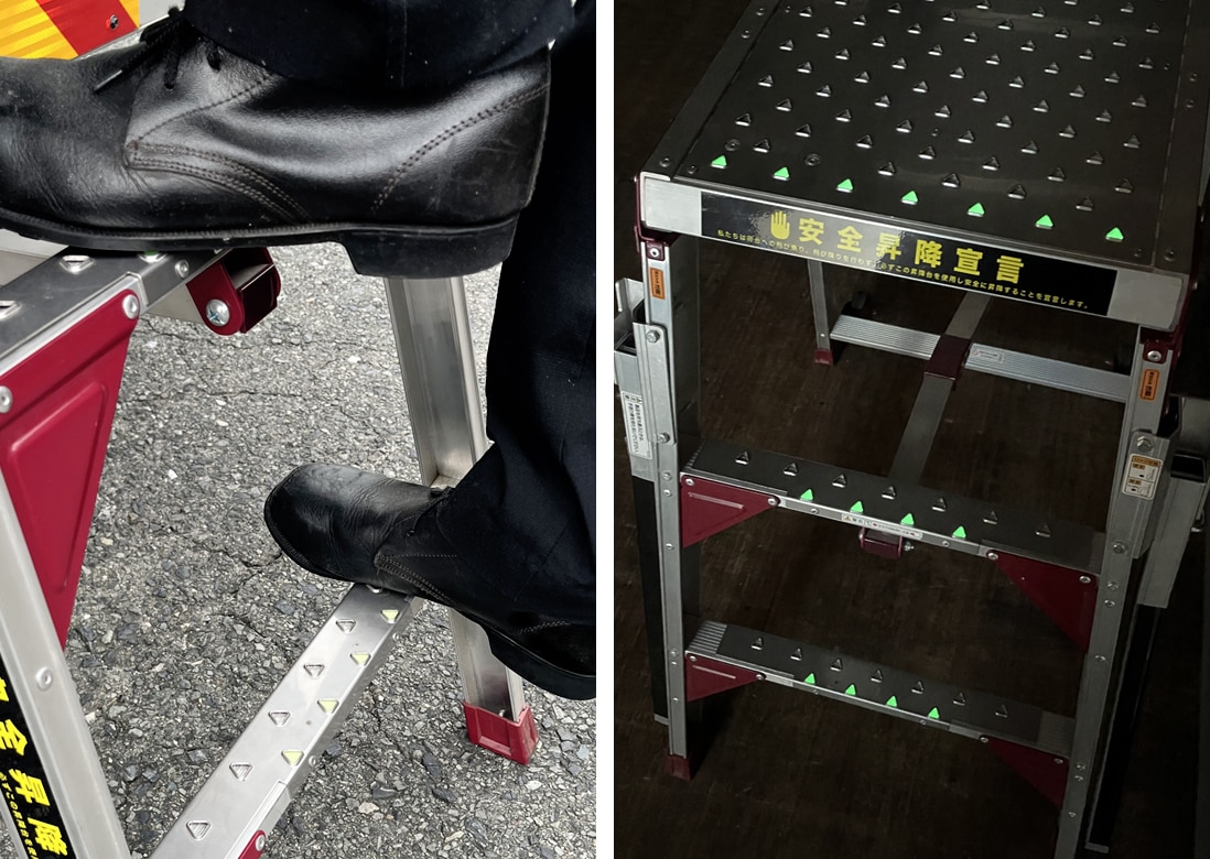 三角突起が靴底をしっかりグリップします。水や油が付いていても滑らず、安心して昇降できます。さらに、ステップ部には暗闇で光る蓄光機能が付いており、暗い現場や夜間でも踏み外しを防止します。