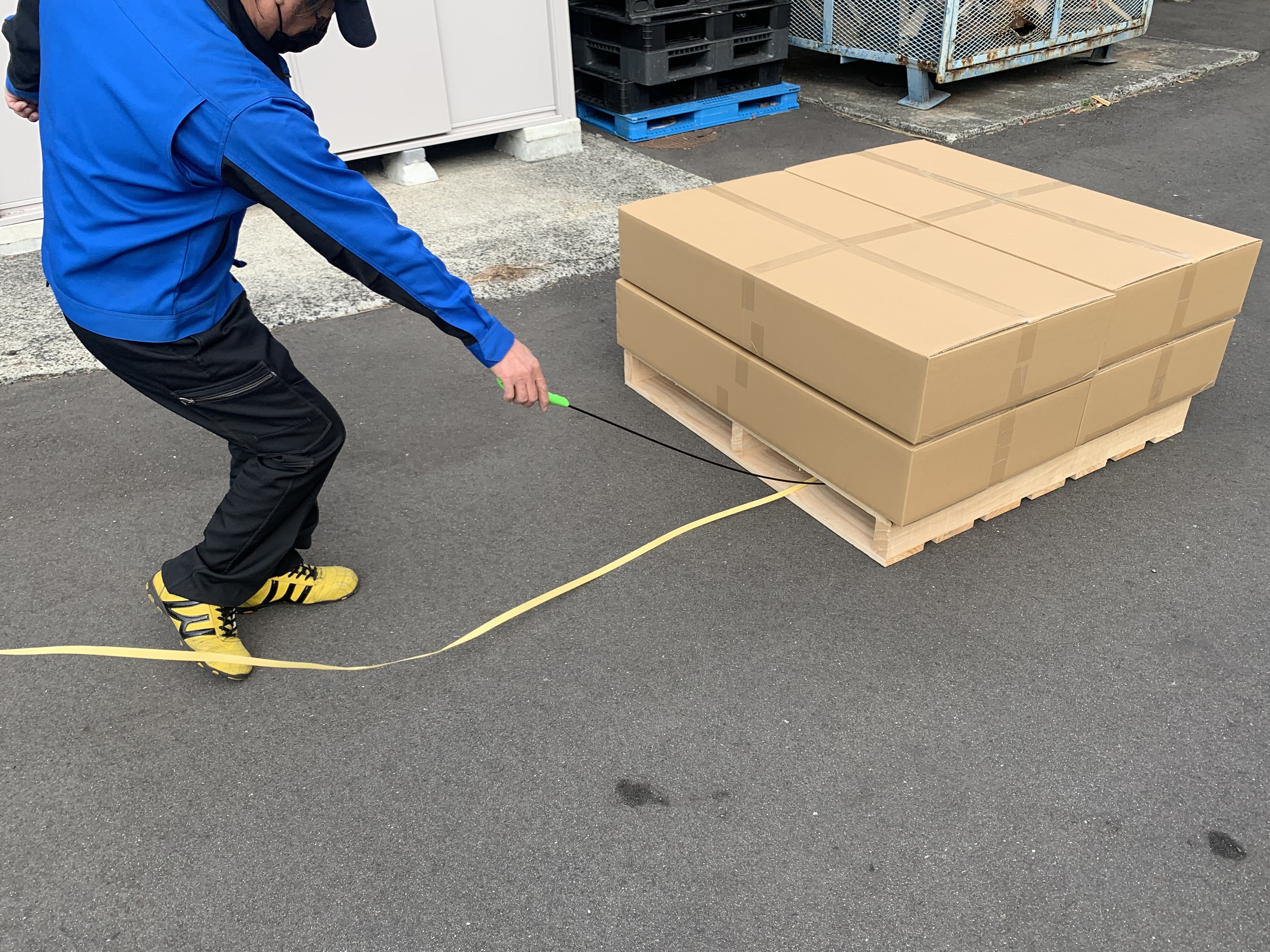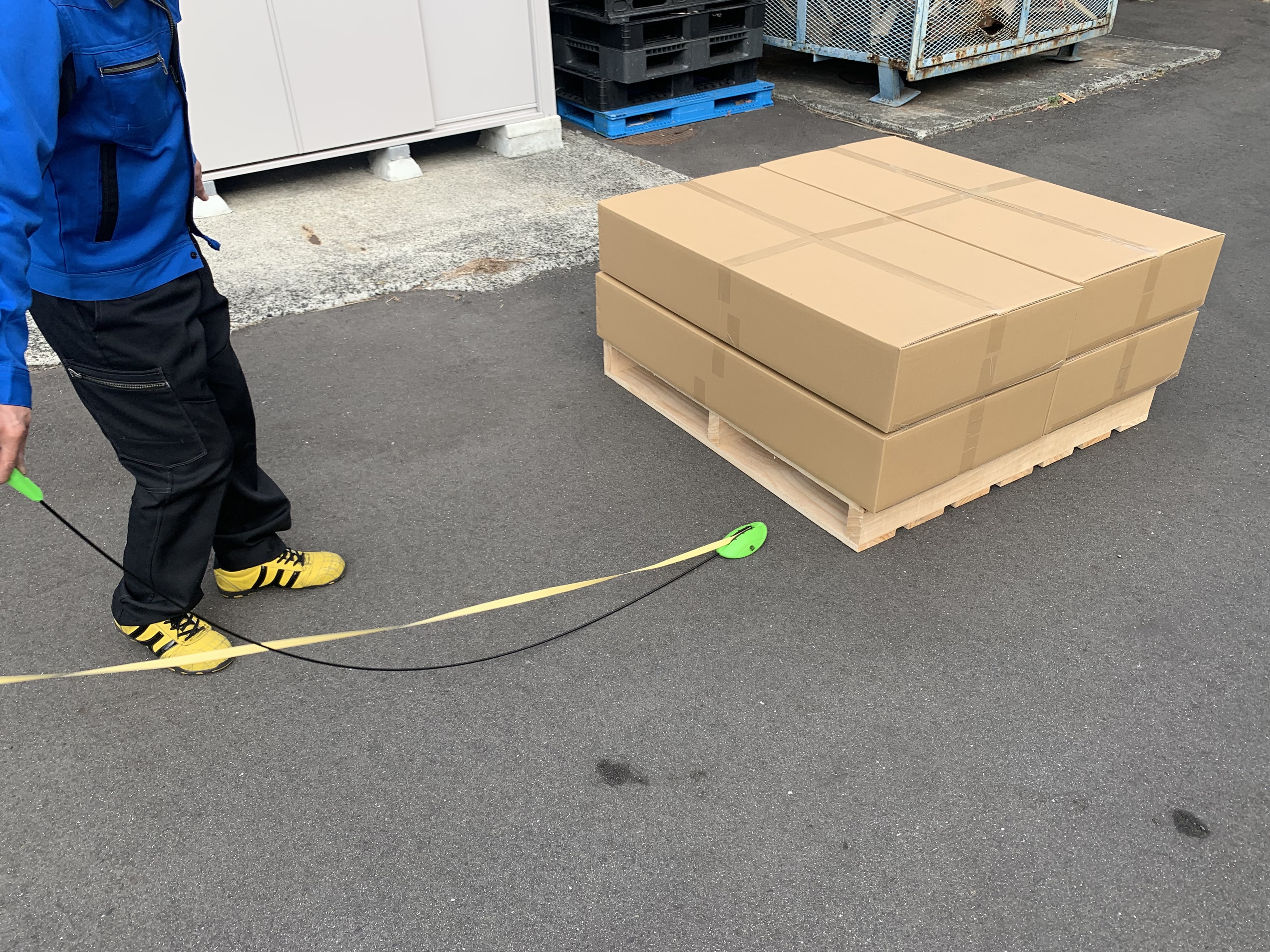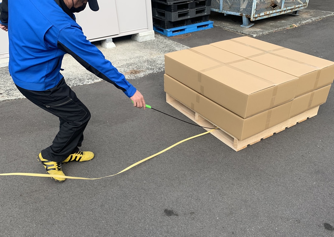 PPバンドを先端に固定し、パレットの間口に投げ込むだけ。