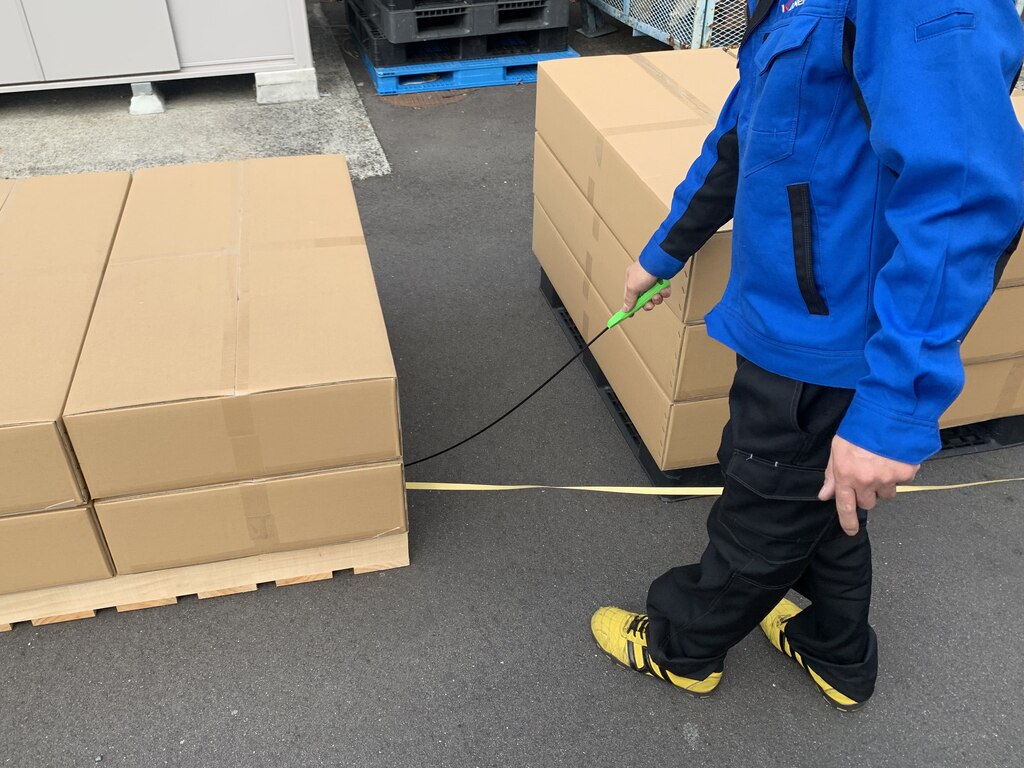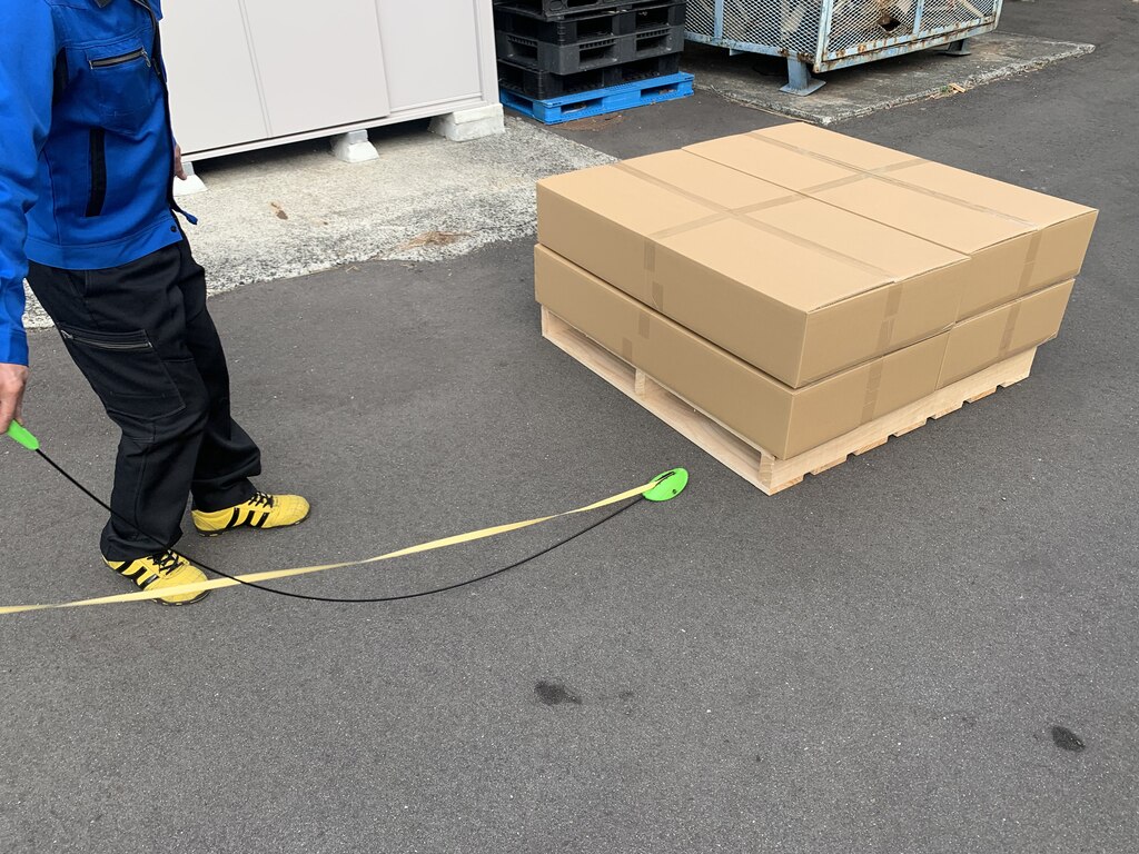 狭い場所でも立ったままバンドを通せるので、パレットをずらしたり、間隔を広く開ける手間がなくなり助かっている。
